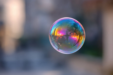Translucent soap bubble reflects vivid colors and blurred cityscape, creating an ethereal effect. The image is a captivating example of light, color, and fragility in harmony