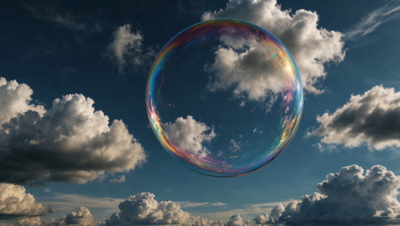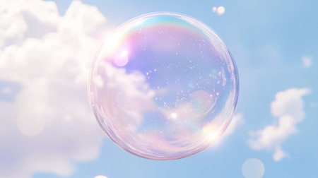 A radiant soap bubble floats gracefully in a blue sky adorned with fluffy clouds, capturing sunlight and creating an enchanting, whimsical scene.