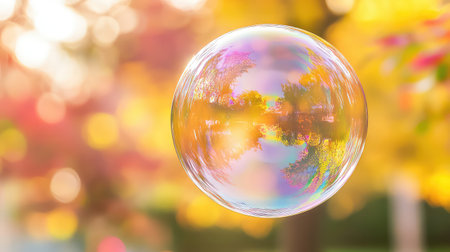 A beautiful transparent soap bubble hovers in the air, reflecting the vibrant colors of autumn foliage in a soft, dreamy background. The bokeh creates a magical atmosphere, enhancing the natural beauty and tranquility of the scene.