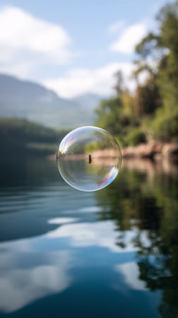 A mesmerizing bubble floating over serene water, surrounded by lush greenery and soft blue skies.
