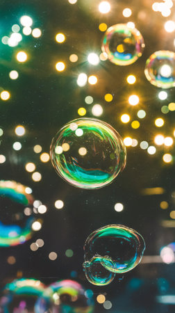Colorful soap bubbles floating gracefully against a backdrop of shimmering lights.