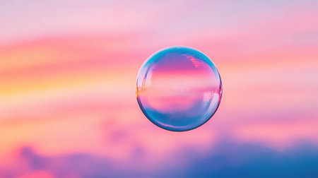 A transparent soap bubble sits on a reflective surface, showcasing a sunset reflected within. The image displays vibrant colors, with the bubble mirroring the orange and purple hues of the sky. The composition emphasizes the play of light and reflection, creating a sense of serenity. Suitable for various visual communication projects.
