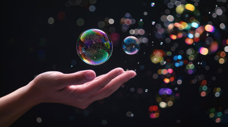 A captivating image of a hand holding colorful soap bubbles against a dark background, highlighting texture and movement. Bubbles shimmer and reflect light, evoking joy.
