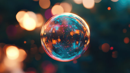Bubble reflecting sunset with bokeh background, artistic photography concept