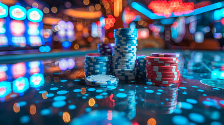 Colorful stacks of poker chips are arranged on a casino table, creating a lively atmosphere for players engaged in the game.