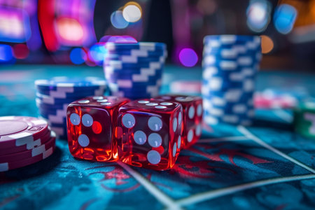 Stacks of colorful poker chips and red dice are lying on a vibrant, patterned casino table, creating a scene suggestive of gambling, risk, and the potential for addiction