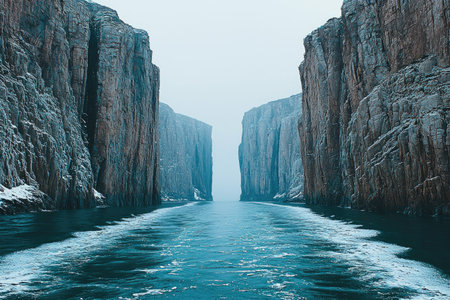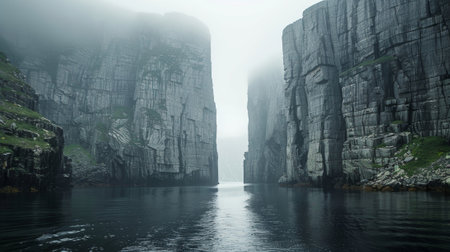 Two towering cliffs stand majestically on either side of a narrow fjord creating a peaceful gateway to the sea