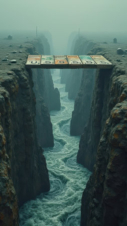 That the image is generated using AI. Abandoned industrial bridge over misty canyon river in foggy landscape.