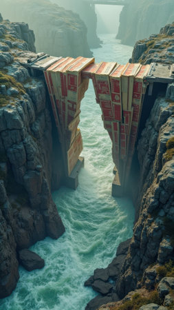 That the image is generated using AI. Precarious cardboard bridge spanning rugged canyon over rushing river.