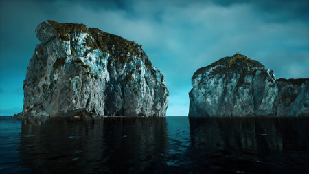 Two towering rocky islands emerge from calm waters as dusk settles in. The landscape is bathed in a cool blue hue, while the sky hints at an approaching twilight.