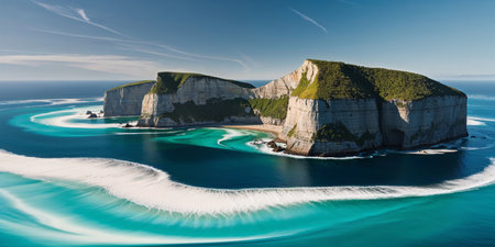 A stunning aerial view of a cliff by the ocean, where the fluid water meets the natural landscape, creating a picturesque and tranquil scene under the open sky AIG50