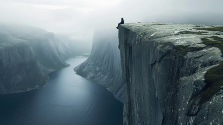 Generative AI : Aerial view of person on a cliff in Nordkapp Skarsvag Finnmark Norway