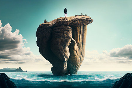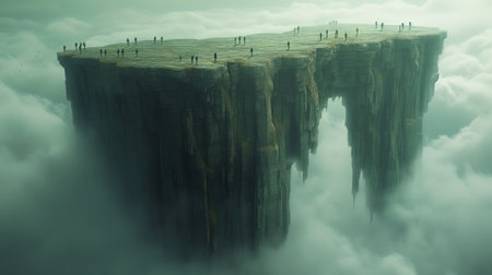 Silhouettes walking on a surreal cliff above the clouds. Conceptual digital painting