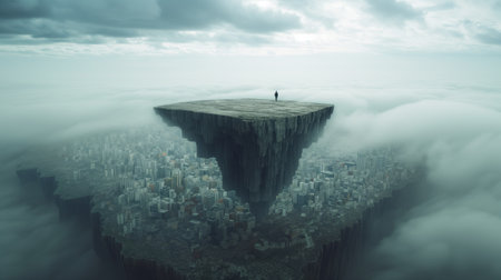 Surreal 3d rendering of a man standing on top of a rock floating above a massive city.