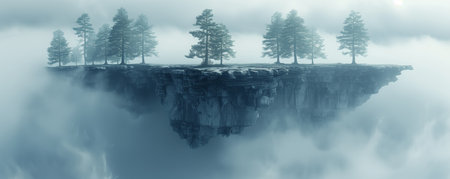 Dreamy floating island with tall pine trees enveloped in misty clouds, creating a serene and surreal fantasy landscape.