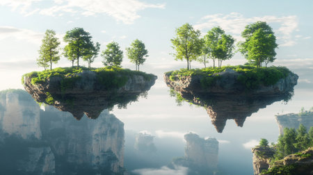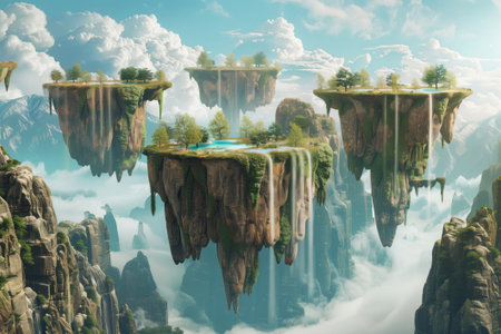 Digital art of serene floating islands with waterfalls against a mountainous backdrop