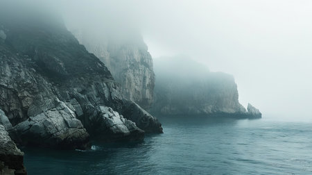 Misty Coastal Cliffside Shrouded in Dense Fog Overlooking Calm Ocean Waters - Concept of Natural Serenity, Rugged Landscapes, Mysterious Atmosphere, and Tranquil Seascapes.