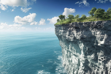 AI Generated. Aerial View of Serene Cliffs Overlooking Turquoise Sea with Lush Greenery and Clear Sky Ideal for Copy Space and Nature Promotions