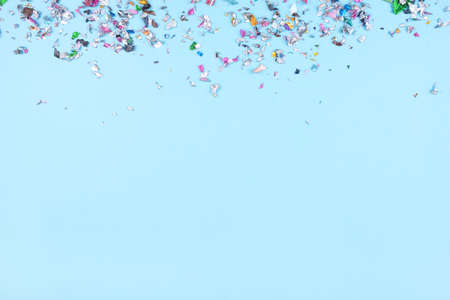 Multicolored confetti on blue background. Flat lay, top view.