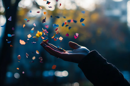 A close-up shot of a persons hand silhouetted against a soft, out-of-focus background, releasing a cascade of vibrant, multi-colored confetti upwards, creating a festive and joyful atmosphere.