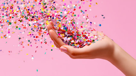 A hand releasing vibrant paper pieces against a blush backdrop, creating an energetic and festive mood ideal for celebrations or joyful events.