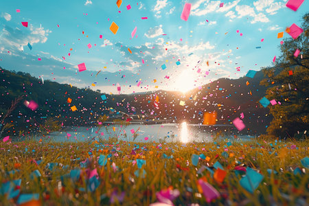 Colorful paper shards drift gently against a dreamy background, evoking a lively spirit ideal for joyful events, festivities, and cheerful gatherings.