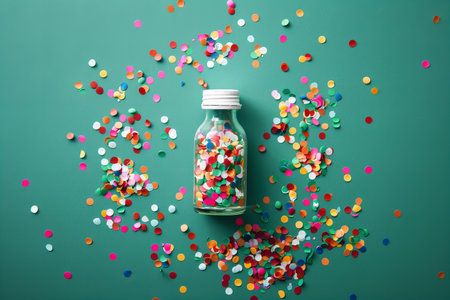 Glass bottle with colorful confetti on green background, flat lay. Celebration concept