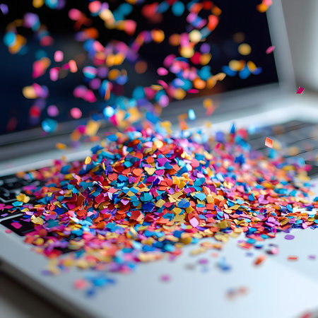 A pile of vibrant confetti sits on a laptop keyboard, symbolizing digital celebration and festive joy.