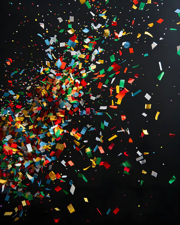 A vibrant burst of colorful confetti against a stark black backdrop. The image captures the excitement and joy of a celebration.