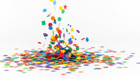 Colorful confetti flying in the air on a white background.
