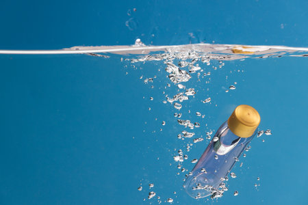 Beauty product bottle falling into water with copy space background on blue background. Health and beauty, make up and beauty concept.