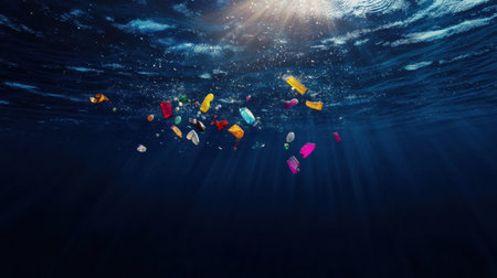 Colorful pieces of plastic waste drift on a deep blue ocean, illuminated by sunlight, highlighting environmental pollution and its impact.
