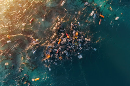 Trash seen in polluted ocean waste floating in illuminated waters image. Concept Polluted Ocean, Trash in Water, Pollution Awareness, Ecological Impact, Marine Environment