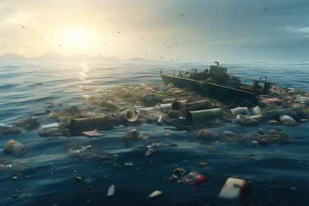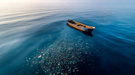 A boat navigates through ocean waters contaminated with trash and debris, symbolizing the urgent need for environmental awareness and marine cleanup efforts.