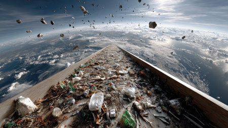 This striking illustration portrays the severe issue of plastic waste pollution in space, emphasizing the floating debris above Earth. The image captures the urgency of addressing environmental challenges and promotes awareness of our planet's fragile state.