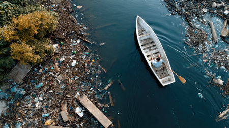 This aerial image showcases a lone rowboat maneuvering through polluted waters filled with debris and waste, highlighting environmental concerns.