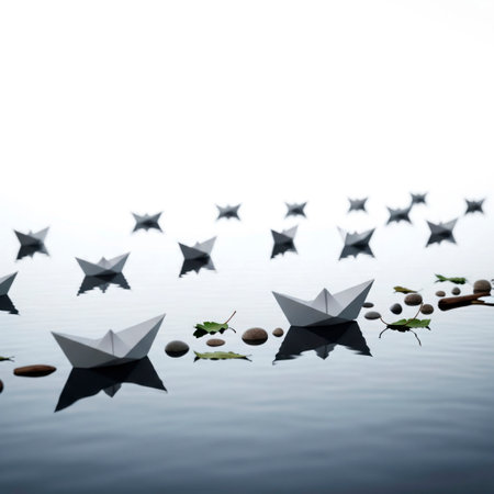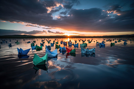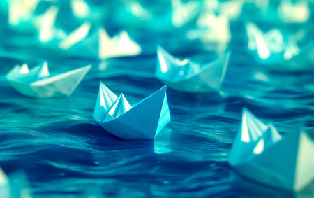 paper boats in water, demonstrating synchronized effort, created with generative ai
