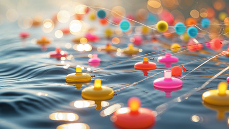 Colorful floating buoys create lively patterns on calm water in a serene environment during sunset