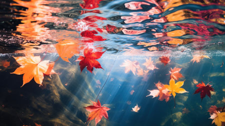 Autumn natural background, web banner. Autumn bright yellow orange red fallen maple leaves under water. Autumn mood atmosphere nature background.
