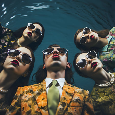 AI generated digital art of a group of people at a fashion photoshoot, wearing sunglasses and funky outfits