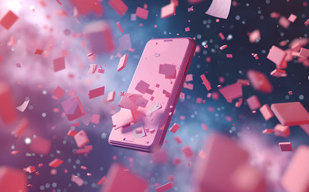 3d rendering of smartphone on light blue background with various geometric shapes flying out of its screen.