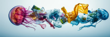 Plastic bags and other plastic garbage floating underwater forming the shape of a jellyfish, symbolizing ocean pollution