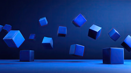 Digital image of several floating, glossy blue cubes on a dark background. The cubes are in various positions, suggesting a sense of movement or dynamic composition. The overall effect is modern and minimalist, using strong color contrast and simple shapes. The image's focus is on the visual interplay of the shapes, light, and color.