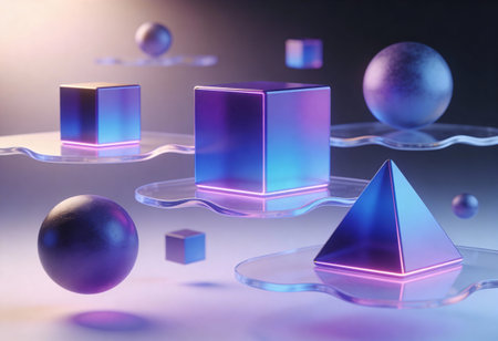 3d render, abstract background, blue and purple geometric shapes, glass balls