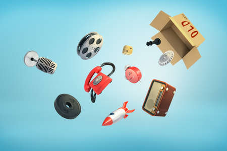 3d rendering of a cardboard box with the title Old on it and various vintage and modern objects scattering out.