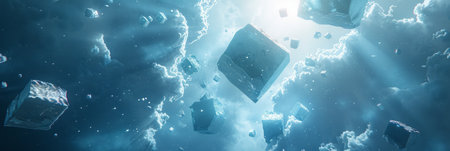 Multiple ice cubes are seen plummeting from the sky. These crystal-clear cubes are of various sizes, scattering as they descend to the ground. The background features a cloudy sky, hinting at the icy precipitation.