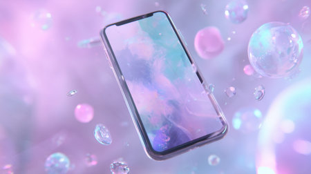 A mesmerizing smartphone displays vibrant holographic visuals, surrounded by whimsical bubbles and sparkling droplets, creating a dreamy and colorful atmosphere.