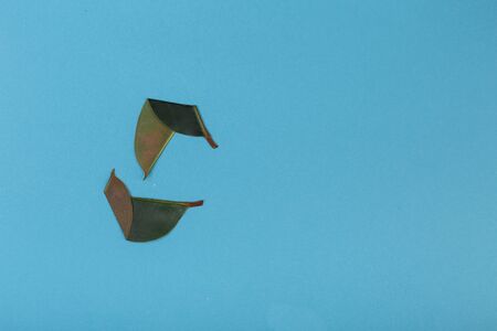 Th leaves of Fig trees in shape broken eco green energy recycling isolated on blue, caption for text.