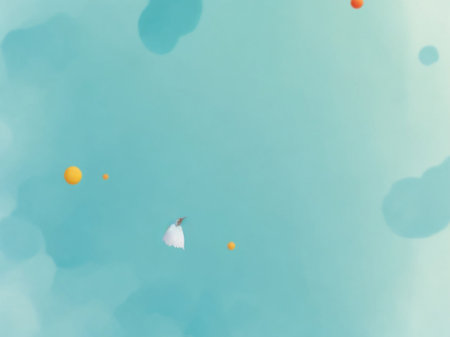 Vibrant shapes and confetti float through the air, creating a lively carnival atmosphere in a bright and colorful setting.