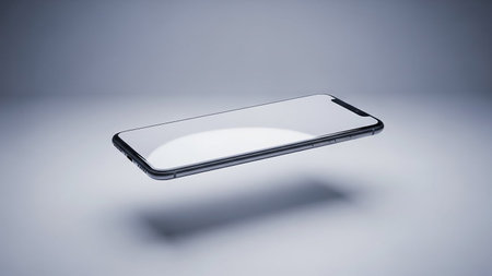 A sleek silver smartphone with a blank white screen floats in a minimalist studio with soft light and shadow.